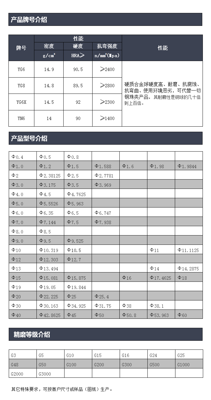 - 2、硬質(zhì)合金球主要成分:它是以高硬度難熔金屬的碳化物(WC、TiC)微米級粉末為主要成分,以鈷(Co)或鎳(Ni)、鉬(Mo)為粘結(jié)劑,在真空爐或氫氣還原爐中燒結(jié)而成的粉末冶金制品,現(xiàn)目前常見的硬質(zhì)合金有YG、YN、YT、YW系列。